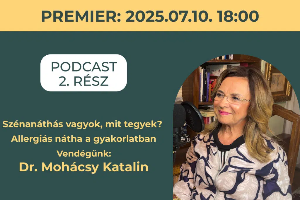 Figyelem: folytatódik podcast sorozatunk! A második részben Dr. Mohácsy Katalin beszél az allergiás betegségekről, szénanátháról és immunterápiáról. Videós formátum, YouTube-premier 2025. július 10-én, csütörtökön 18:00-kor – orvosi tények mellébeszélés nélkül. Ha számít Önnek az egészsége, ezt ne hagyja ki.